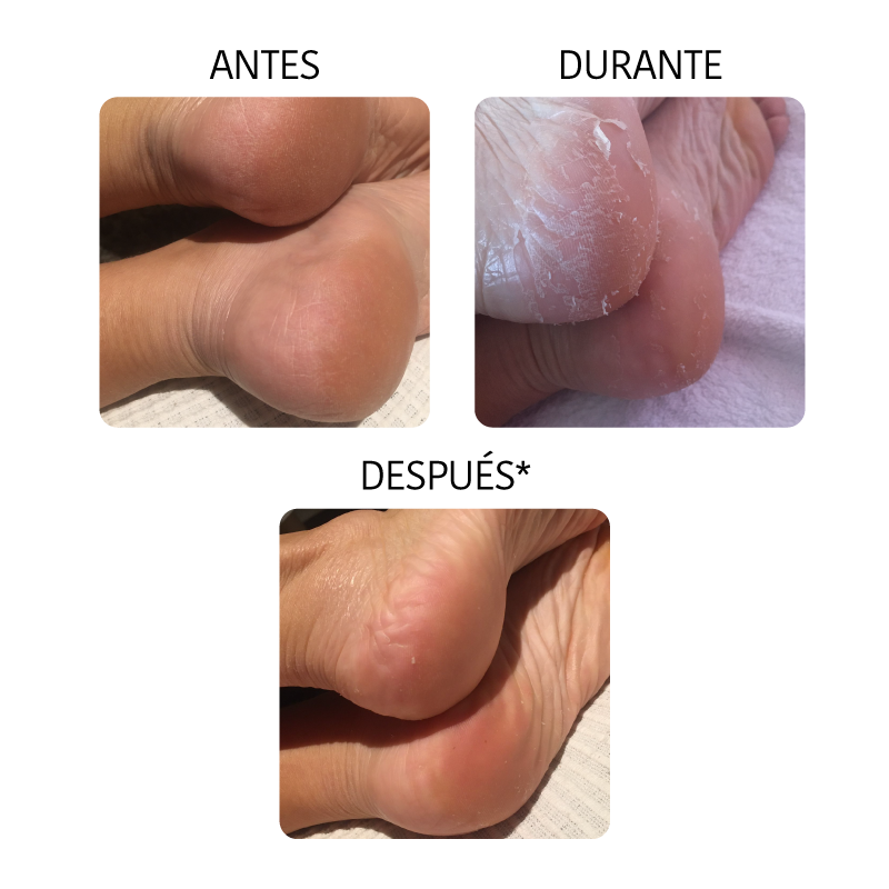 IMPORTANTE: NO te arranques las pieles muertas durante el proceso de exfoliación. Podrías hacerte daño. NO te hidrates los pies durante estos días, aunque te los notes secos. Frenaría la exfoliación. Las personas diabéticas y mujeres embarazadas deberán consultar con su médico antes de la aplicación del producto. No utilices este producto si sufres de irritaciones, piel sensible, onicomicosis, pie de atleta y otras formas de piel abierta/irritada en los pies.