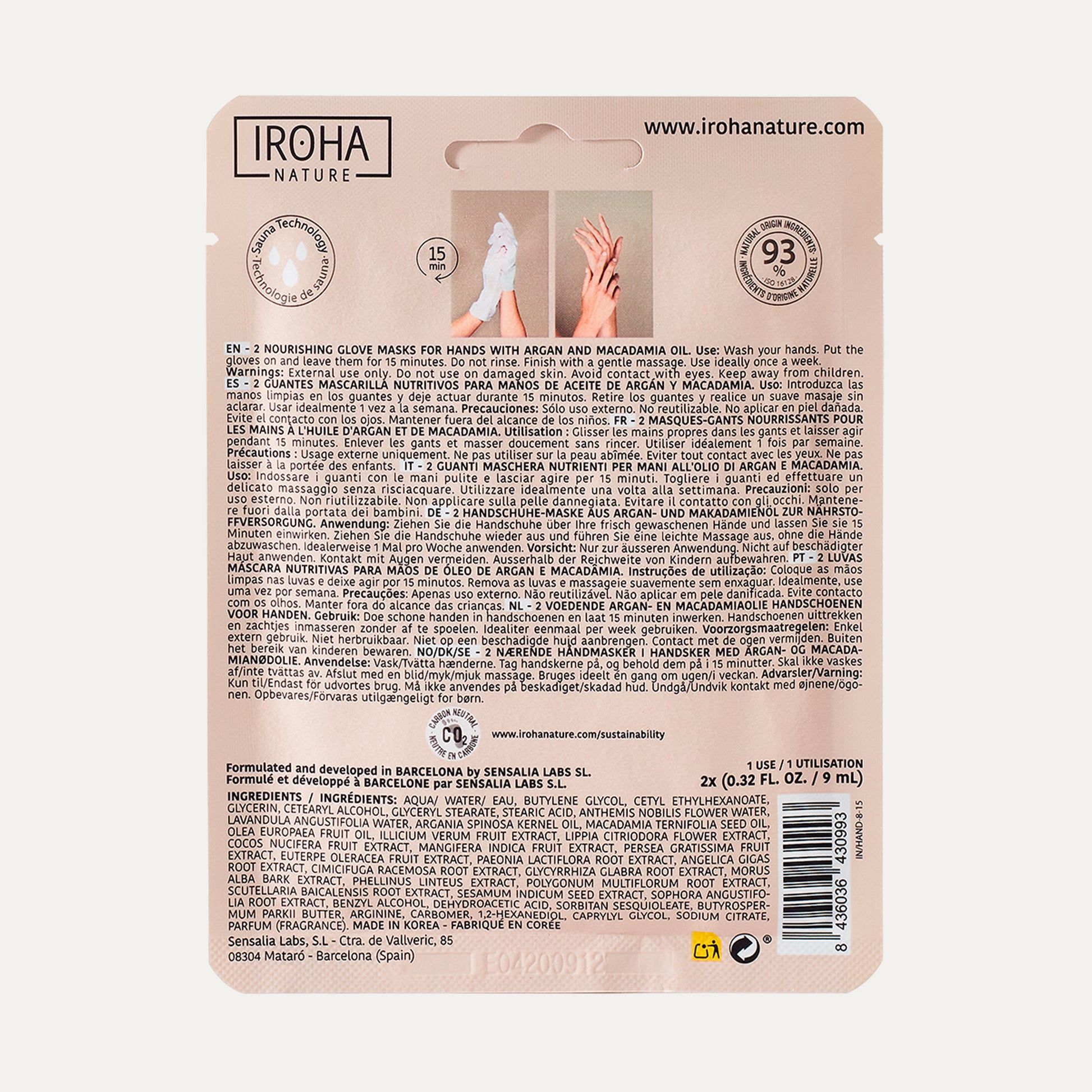 The Nourishing Hand Mask with Argan Oil and Macadamia helps to intensely hydrate dry and dehydrated hands while repairing and nourishing them. It also contains Macadamia Oil, which softens, hydrates, and regenerates the skin. Thanks to their double-layer technology, the gloves create a sauna effect that enhances the results.