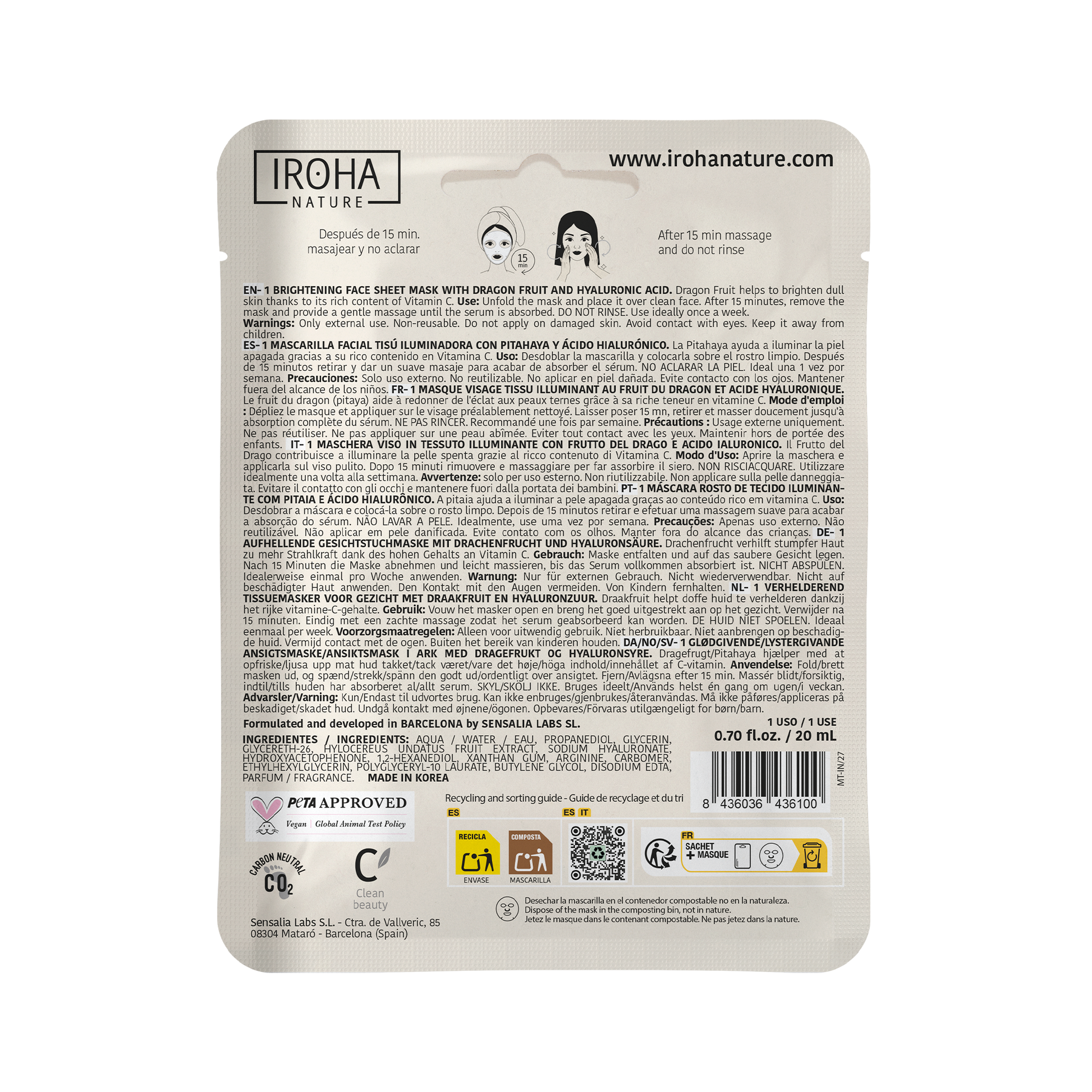Facial mask with Pitahaya, perfect to illuminate the dullest skins and unify the tone and restore the skin's luminosity to give it a healthier appearance. This mask revitalizes the skin with a shot of luminosity and thanks to the presence of Hyaluronic Acid it provides intensive hydration with a flash effect to the skin.