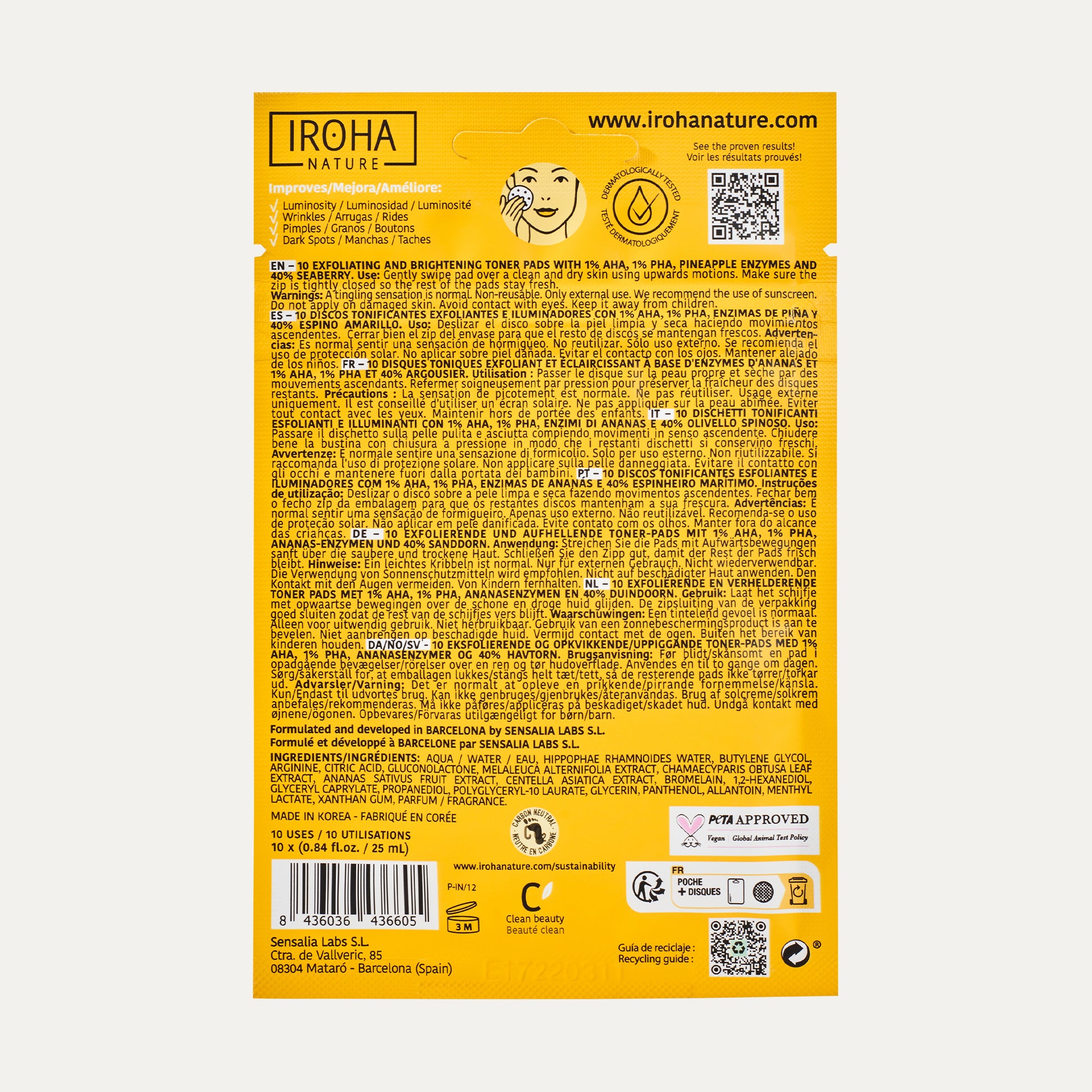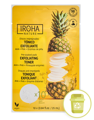 Iroha Nature's exfoliating and brightening facial toner, with 98% natural ingredients, is formulated with AHAs, PHAs, and pineapple enzymes. These toning discs gently cleanse and exfoliate the skin by removing impurities, excess sebum, and traces of dirt and makeup. Additionally, they help rebalance the skin's pH, enhance luminosity, even out the tone, and prepare the skin for other treatments. The pre-moistened pad format is ideal for traveling, as it takes up minimal space in your suitcase or bag. Thanks to its zip closure, you can prevent unwanted liquid spills.