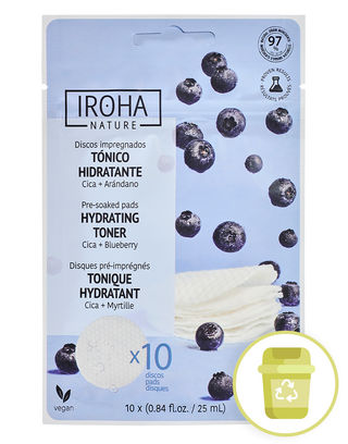 Iroha Nature's Hydrating and Soothing Facial Toner with 97% natural ingredients. These toner pads help deeply hydrate and soothe all skin types, particularly sensitive and irritated skin. They help rebalance the skin's pH, complete the cleansing process by removing residual dirt, reduce redness, promote healing, and prepare the skin for further treatments. The formula contains Blueberries, Centella Asiatica, and Panthenol. The convenient zip closure ensures you can take them anywhere without worrying about liquid spills.