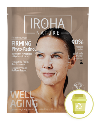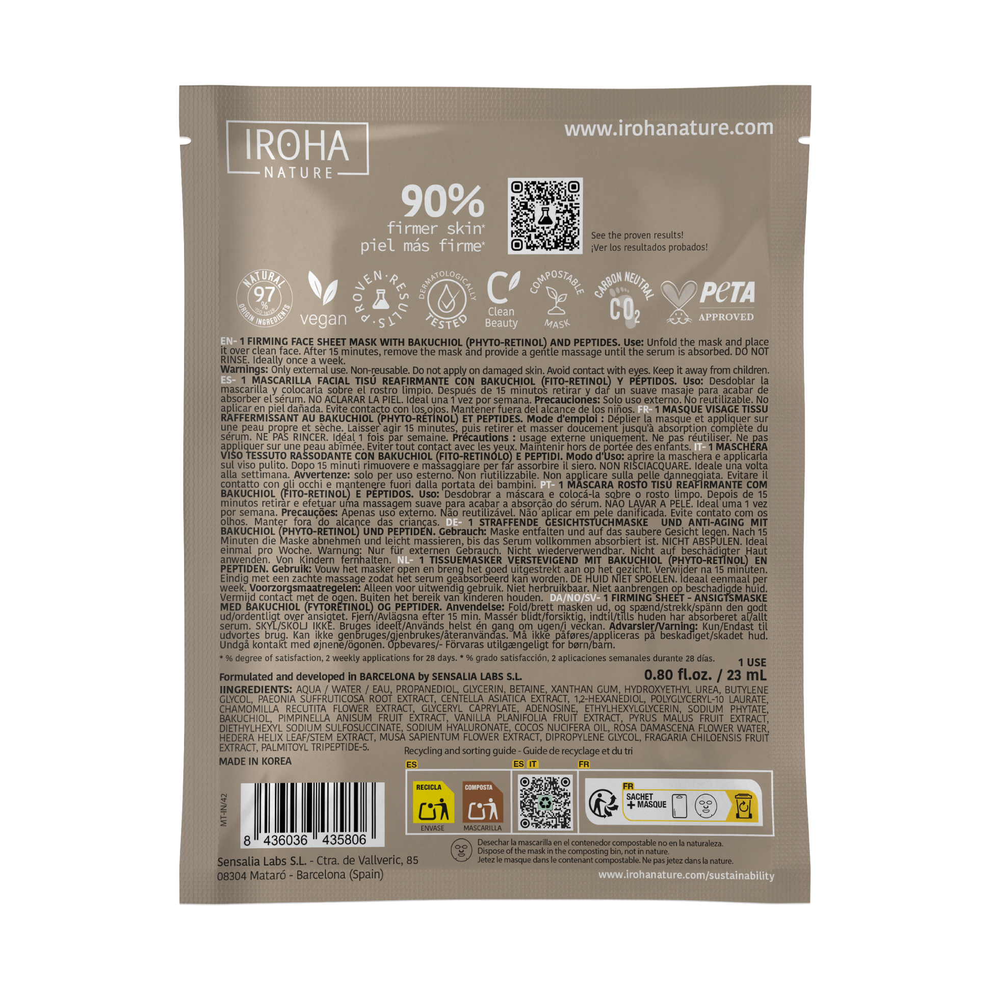 Smoothing and Hydrating Face Sheet Mask with Bakuchiol, a vegan alternative to retinol, which stimulates collagen synthesis to enhance skin elasticity and firmness, while unifying skin tone and adding luminosity to the face. This tissue mask also contains peptides that help delay the aging process and prevent the formation of wrinkles and expression lines. Additionally, Hyaluronic Acid provides instant hydration and softness.