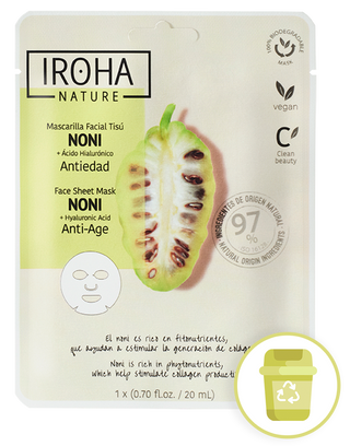 Anti-aging facial mask enriched with Noni that promotes collagen synthesis improving skin firmness and elasticity. Perfect anti-aging ally that fights against the first signs of aging by smoothing and reducing the appearance of wrinkles and fine lines. In addition, this sheet mask contains hyaluronic acid that provides instant hydration and softness.
