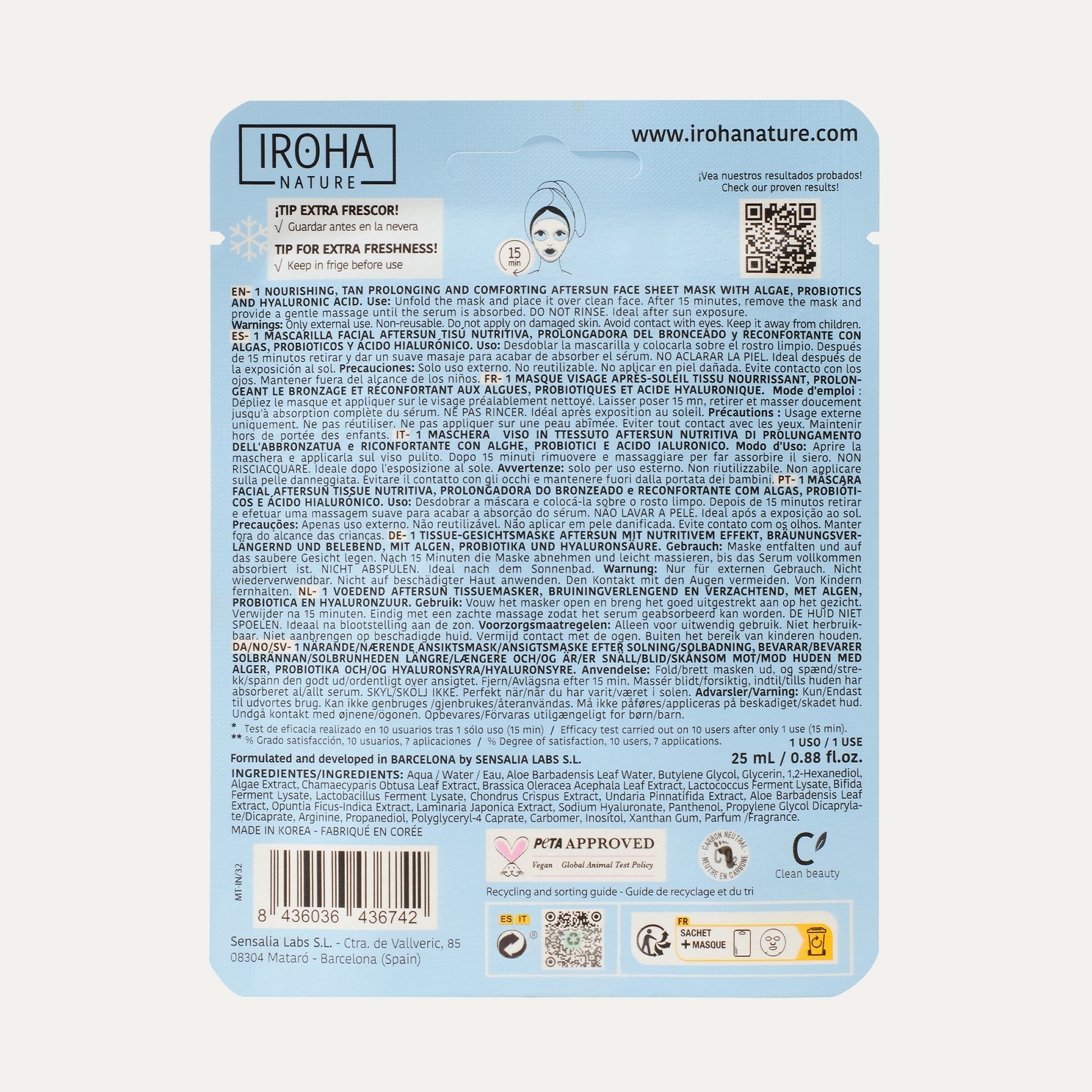 Our masks feature a tissue fabric that is 100% biodegradable and are made of cotton and eucalyptus from sustainable forests. This biodegradable fabric offers an excellent system for optimal penetration of actives and best results, while respecting the environment, as they degrade in the soil in only 75 days without leaving a trace in the ecosystem if recycled in the organic container.