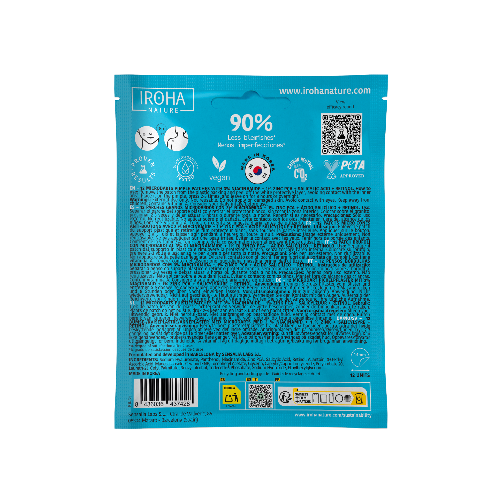 Thin and transparent patch with a double advanced technology of a hydrocolloid base and a central system of 175 solid microdarts: the microdards are composed of a solid matrix of freeze-dried Hyaluronic Acid that incorporates active ingredients such as Salicylic Acid, Niacinamide, Zinc PCA and Retinol.