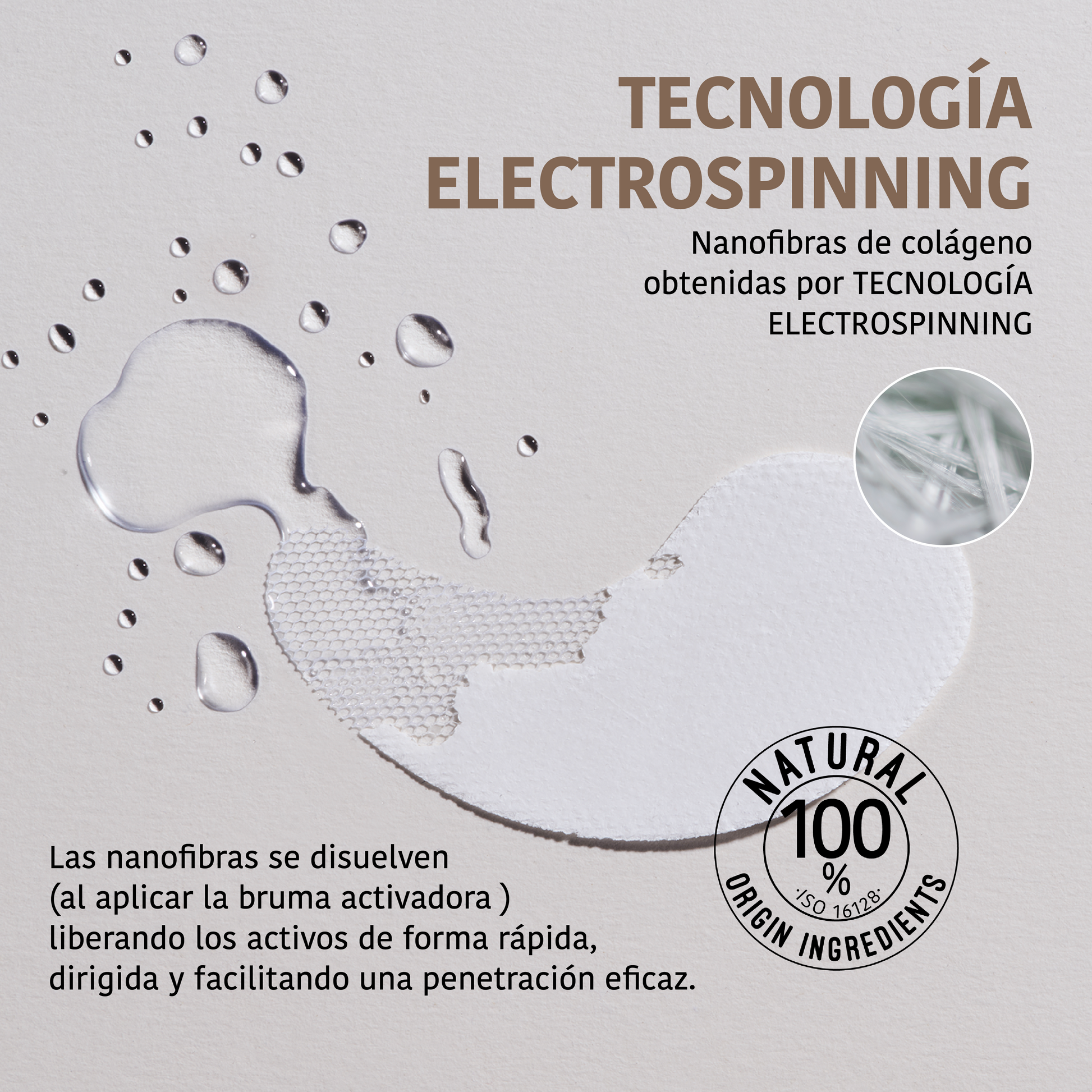 An advanced process that creates an ultra-fine mesh composed solely of active ingredients, with no excipients or additional components. The nanofibres have a biomimetic structure and adhere to the skin, instantly dissolving upon contact with the activating mist.